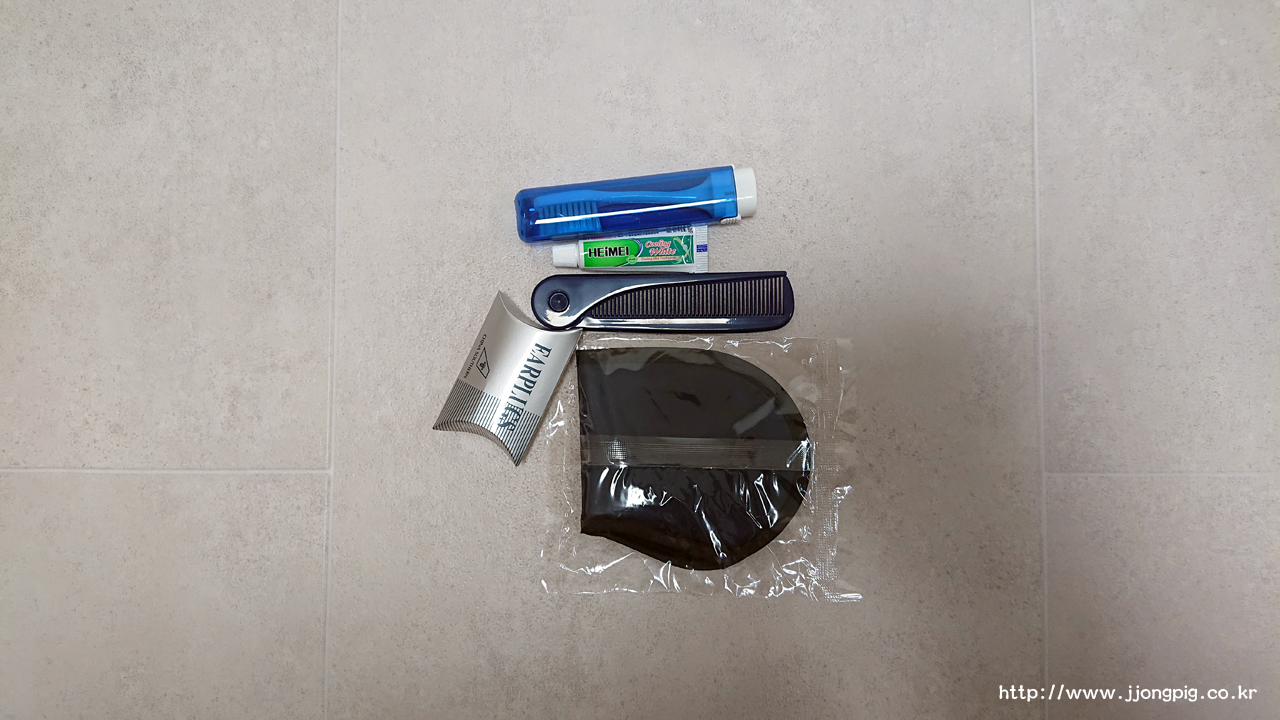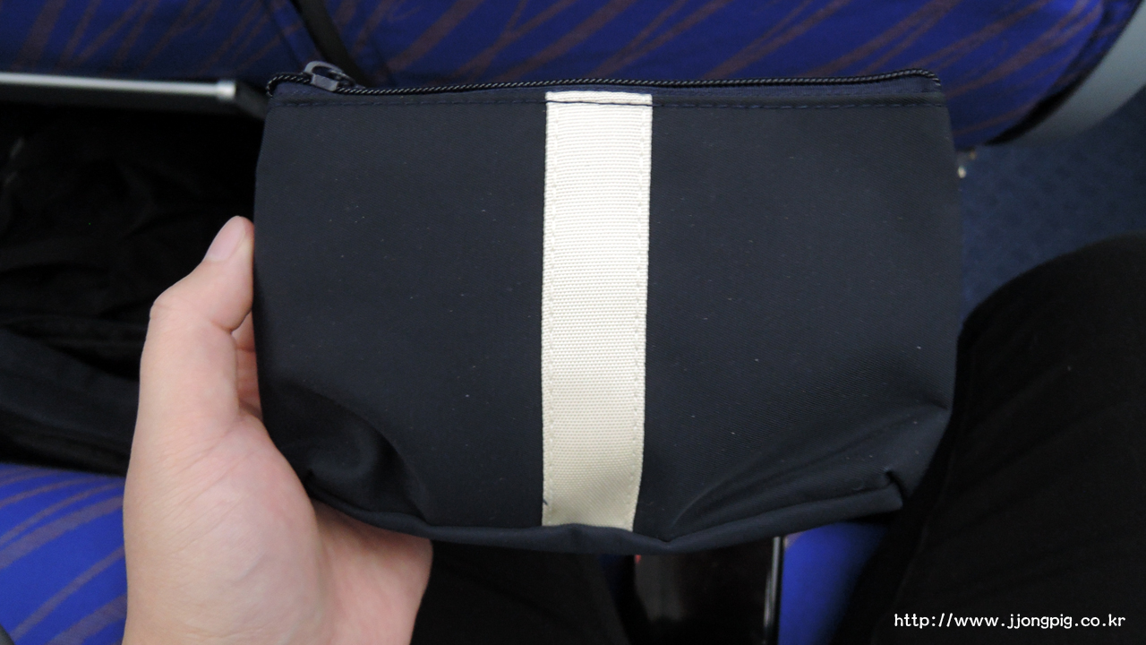 파우치도 제공이 되는데, 양치할 칫솔과 치약 및 안대, 머리빗, 귀마개로 구성되어 있다.