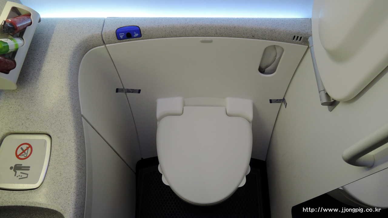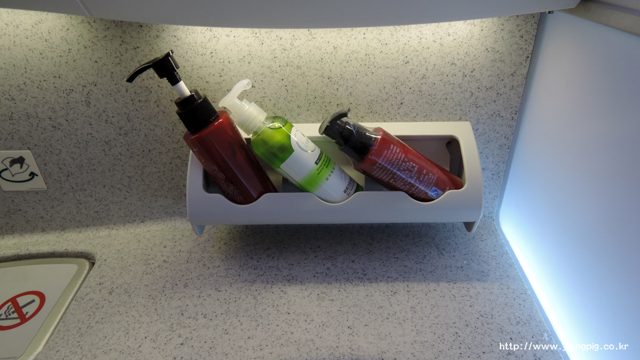 일정 시간이 지나도 화장실 특유의 불쾌한 냄새는 나지 않았다. 승무원들이 거의 1시간에 한번씩은 꼬박꼬박 열심히 청소를 해놓는다. 위의 사진들도 비행 12시간 정도 있다가 찍은건데도 상태가 매우 깨끗하다는 것을 알 수 있다.