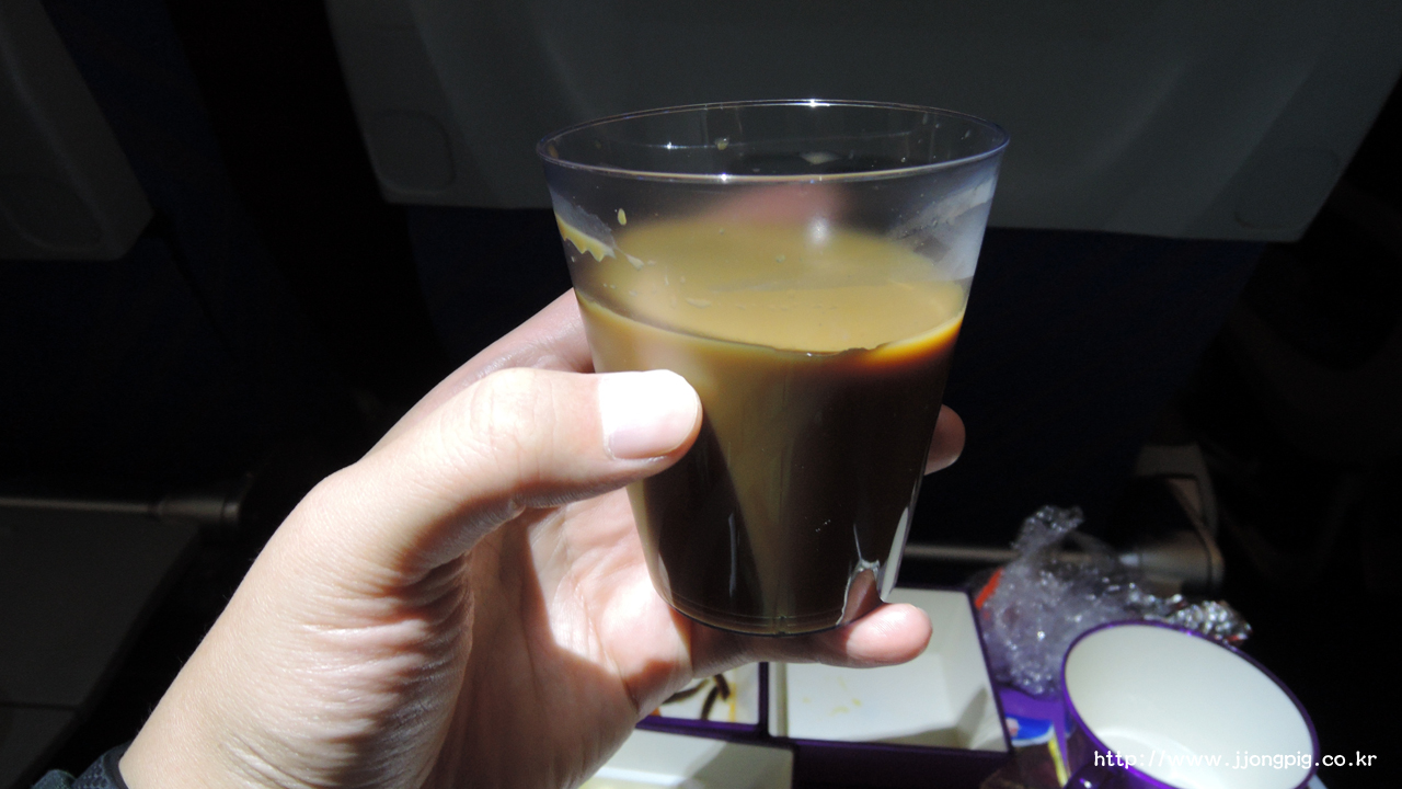 커피는 블랙커피와 밀크커피를 선택해서 제공받을 수 있는데, 밀크커피는 2:1:2 (커피:설탕:프림) 정도의 비율이라고 보면 될 것 같다. 다만 찜찜한거는 컵인데, 뜨거운 커피를 저렇게 플라스틱 컵에 그냥 줘도 되는건지... 환경호르몬 위험은 없나 싶고, 기내식 트레이에 있는 컵은 거의 활용을 안하고 있었다.