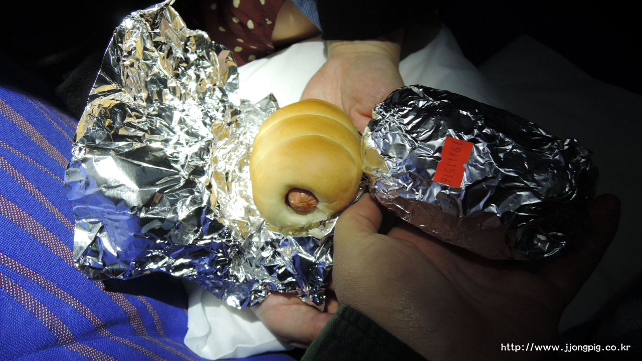 비행 중간에 갤리에서는 샌드위치를 꺼내서 먹을 수 있고, 승무원이 소세지 빵을 제공하는 시간도 있다.