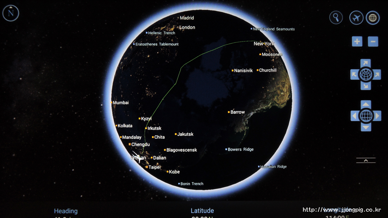 뉴욕에서 그린란드를 지나 노르웨이 스발바드군도(우리나라 다산 북극기지가 있는 곳)지나 이르쿠츠크 등을 거쳐 우한으로 가는 경로였다. 비행기 엔진 두개만 가지고 이렇게 다니는 것을 보면 매번 경이롭다.