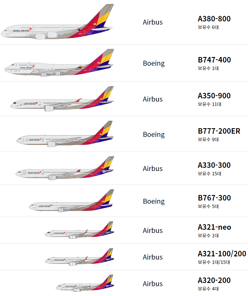 - 대한항공은 Boeing에 좀 기울었다면 아시아나는 거의 Airbus에 누웠다고 보면 될 것 같다.