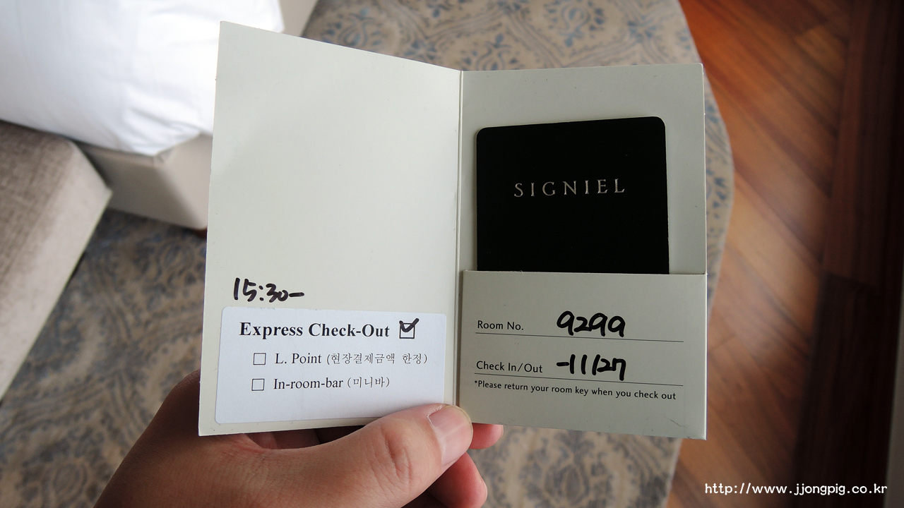 특급 호텔의 특징은 정오에 체크아웃 하는 손님들로 붐빈다는 점이다. 그래서 시그니엘에서는 익스프레스 체크아웃이라는 서비스가 가능하다고 하는데 미니바 이용 정도면 그냥 키만 주고 가면 된다는 것이다. 그러면 알아서 신용카드로 디파짓 한거에서 차감하는것으로 마무리 된다는 것인데, 좋은 방법이라고 생각한다.