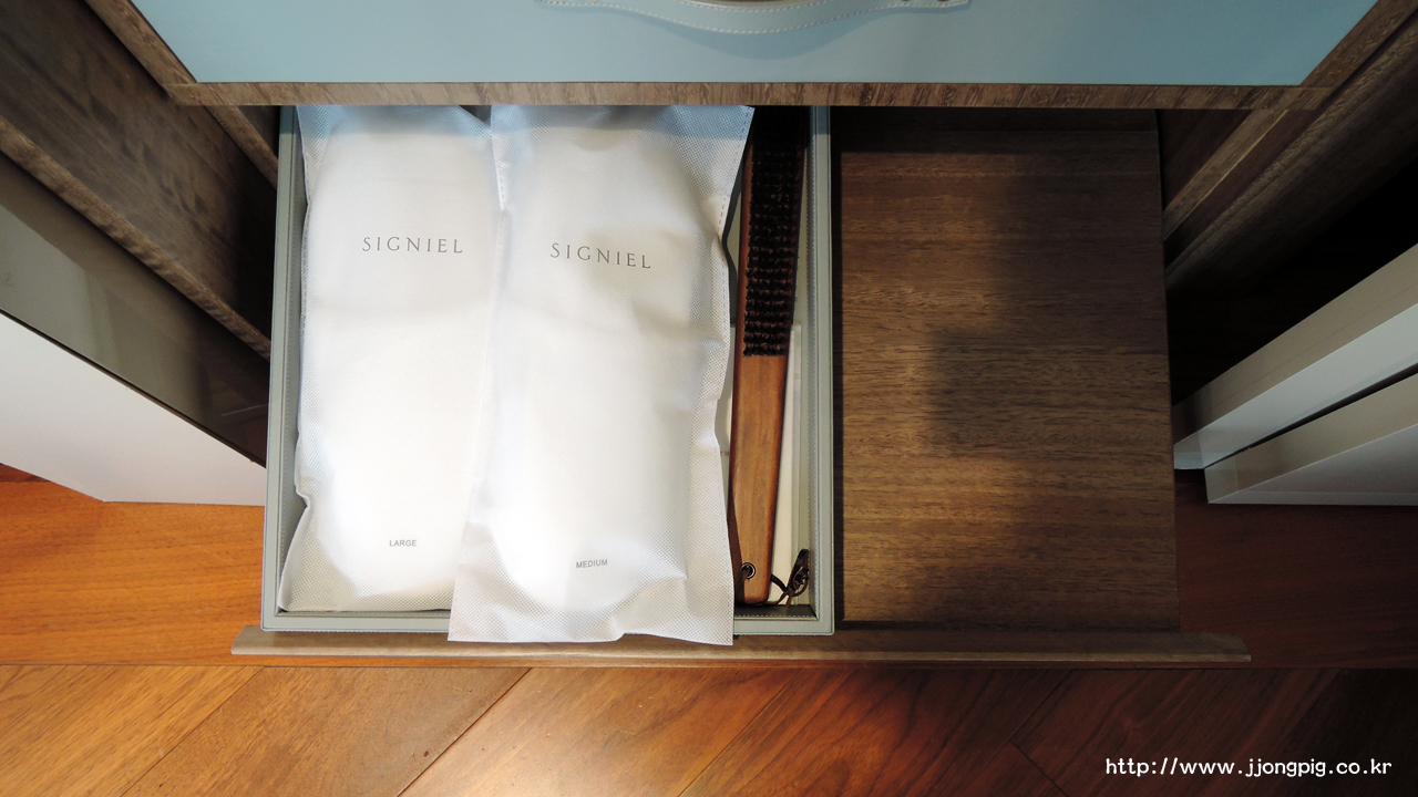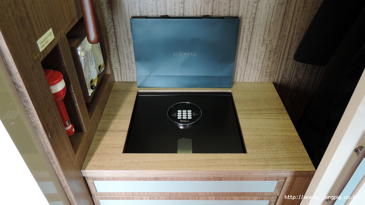 옷장안에 금고가 있다. 처음에는 개인 가방을 올렸다가 자꾸 버튼이 눌려서 좀 불편했는데, 서랍안에 넣었으면 어떨까 싶기도 했다. 쇼핑백?도 있는데 시그니엘 브랜드가 시그니처와 롯데의 L이 합쳐진 의미라고 알고 있다. 현대차그룹에 제네시스 라는 브랜드가 있는것처럼 시그니엘도 그런 브랜드로 점점 확장해나가지 않을까?