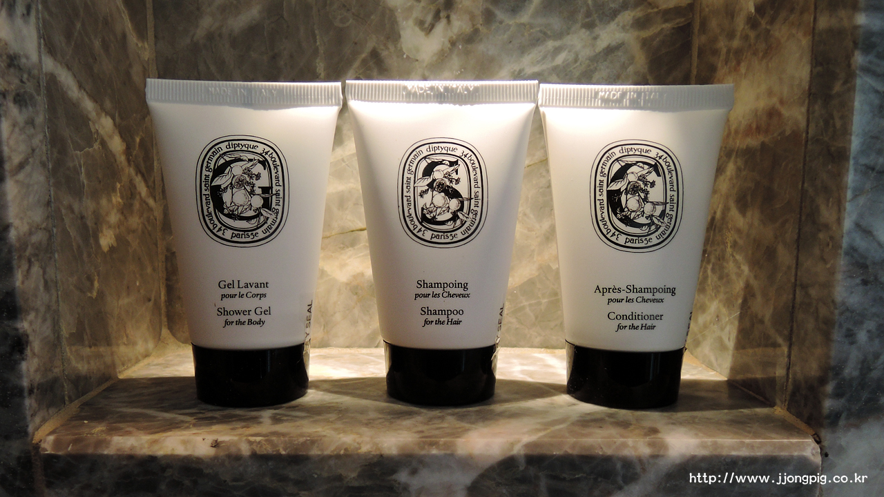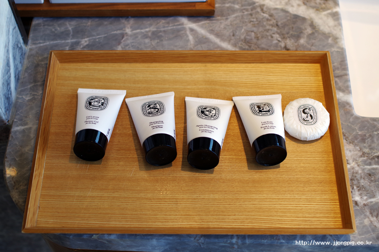 어메니티 구성 중에 샤워젤, 샴푸, 컨디셔너, 비누 등은 딥디크 제품을 쓰고 있다. 사실 나는 LG생활건강, 애경 등의 제품을 써도 상관없지만 이 제품의 향이 정말 좋았다. 수세미(loofah)도 천연재료로 만들어진것 같다.