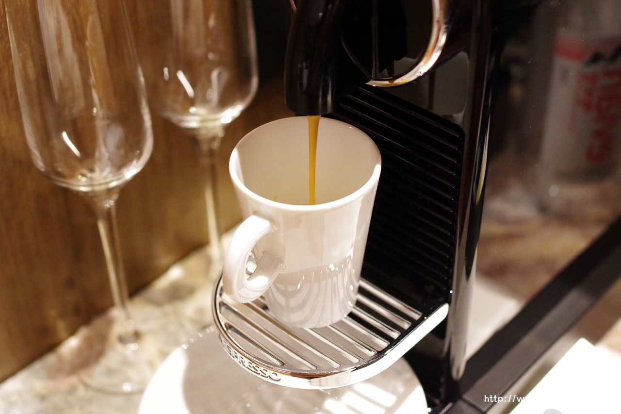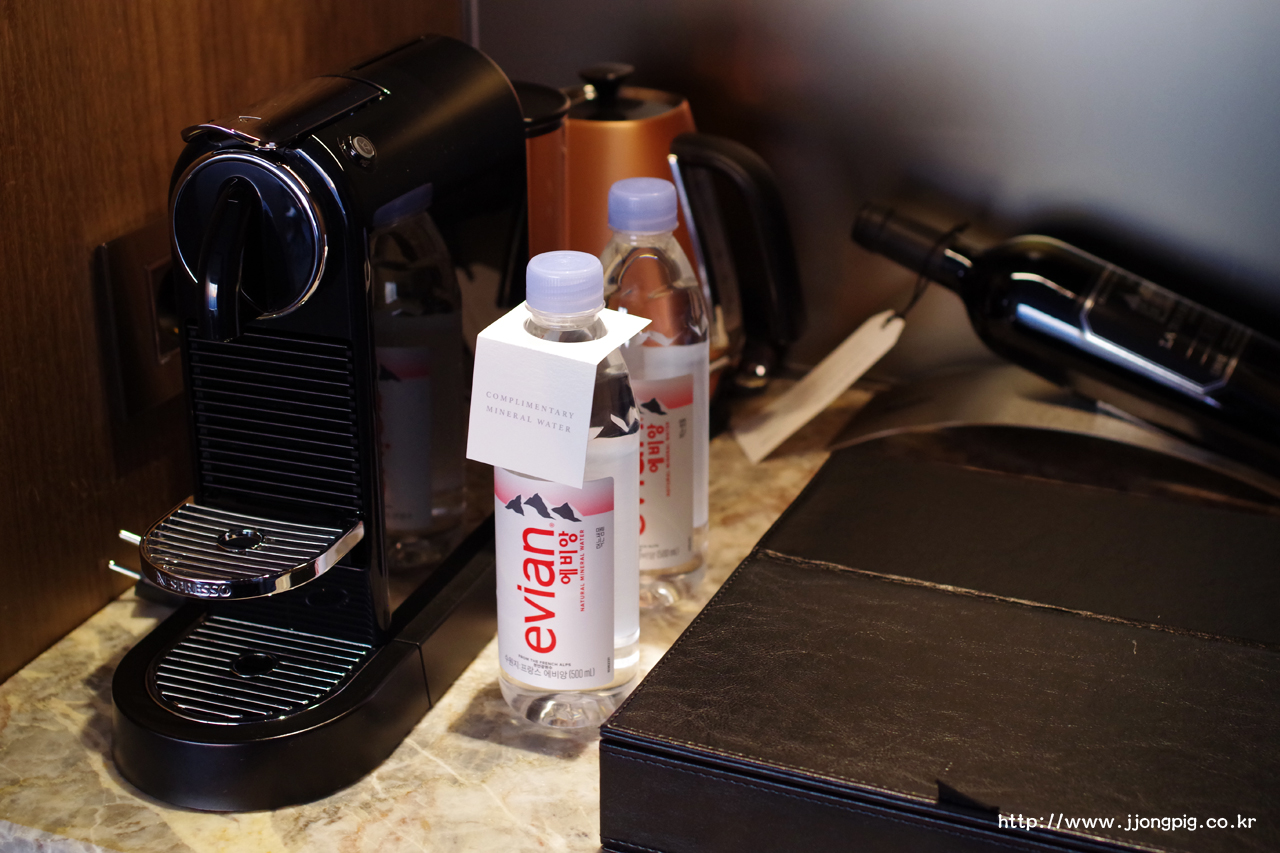무료로 제공되면 좋겠지만 그럴 일은 없다. 에비앙 생수와 티백 정도만 무료이고 네스프레소 머신으로 커피를 마실 수 있는데, 디카페인 커피도 갖추고 있다. 과자는 수입과자류 들이 대부분이고, 맥주나 음료 등은 롯데계열 호텔답게 롯데와 관련된 제품들로 채워져 있다.