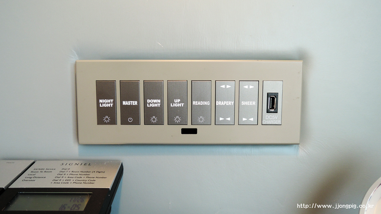 침대 옆에는 전화기, 시계, 다양한 리모컨 등이 있었는데, 창가쪽 커튼을 컨트롤 할 수도 있다. 커튼은 내가 직접 살짝 당기면 전체가 닫히고 밀면 전체가 열리기도 한다.