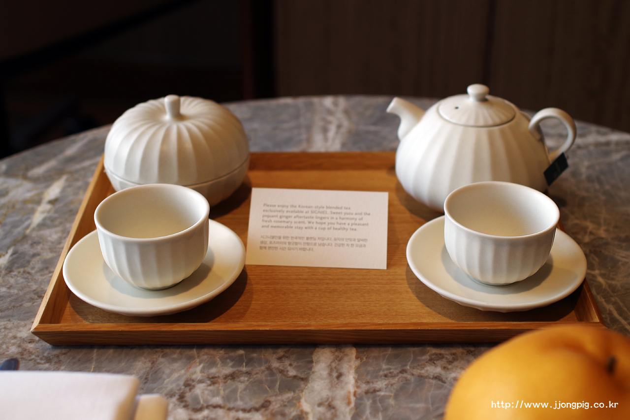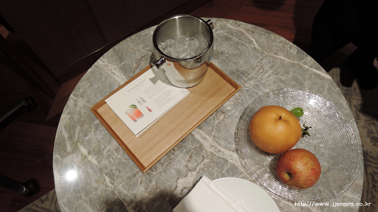 사실 체크인 하는 동안 웰컴 드링크 등을 주는 경우가 일반적인데, 시그니엘 서울은 체크인 후 방에 들어가서 제공을 해준다. 미리 셋팅되어 있지는 않고 별도로 갖다주셨었는데, 결혼기념일이라고 과일 등도 무료로 제공해주었다.