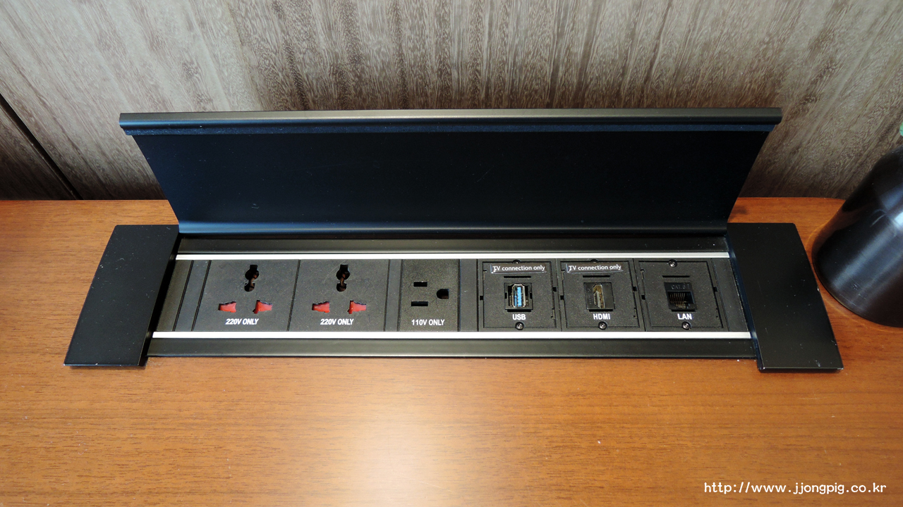 여기서 공부하라고 하면 잘 될 것 같지만, 뷰라는 유혹을 견뎌내지는 못할 것 같다. 처음에는 플러그가 2개 밖에 안보여서 생각보다 너무 적다 싶었는데, 여기 데스크에서 해결을 할 수 있었다. 110V 플러그가 있는것이 독특했지만, 무엇보다 HDMI 포트가 있어서 바로 TV로 연결이 가능한데, 노트북 등을 가져온 경우 TV에 연결해서 활용할 수도 있다. 케이블은 호텔에 요청하면 대여해주지 않을까 싶은데 확인이 필요하다.