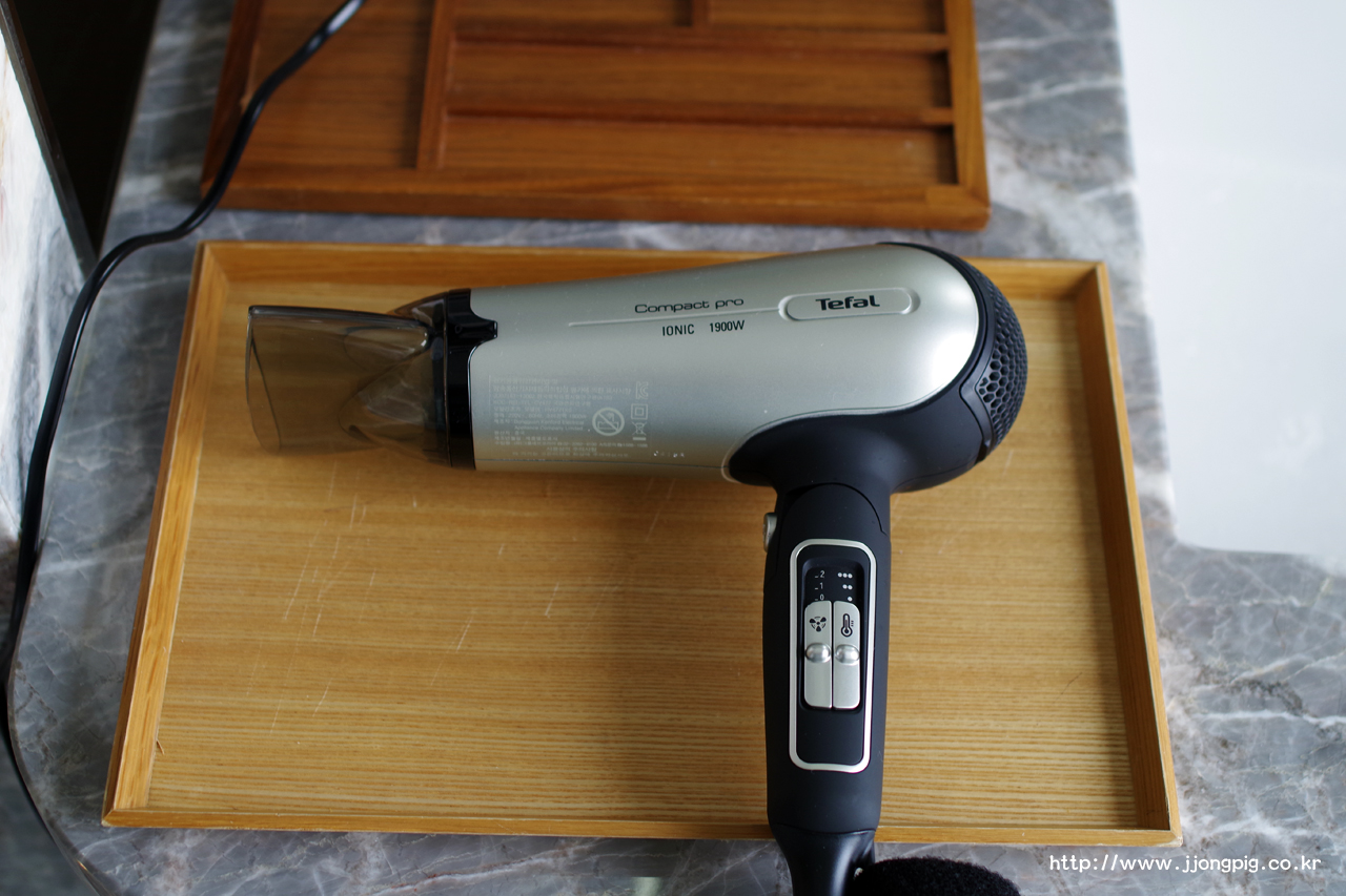 세면대 쪽도 구성이 알차다. 세면대는 1개이고, 하단에는 체중계, 헤어드라이어, 목욕 가운, 수건 등이 비치되어 있다. 세면대 옆에는 손 닦는 수건과 기타 물품들이 구비되어 있으며, 플러그인도 110V와 220V 모두 사용 가능하다. 헤어드라이어는 테팔 제품인데 가볍고, 바람 좀 세게나오고 냉풍 기능이 있는 가성비 좋은 모델 정도로만 구성이 되어있다.