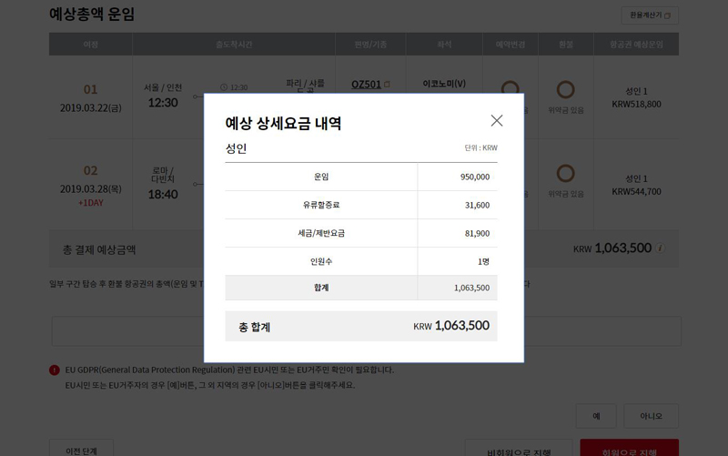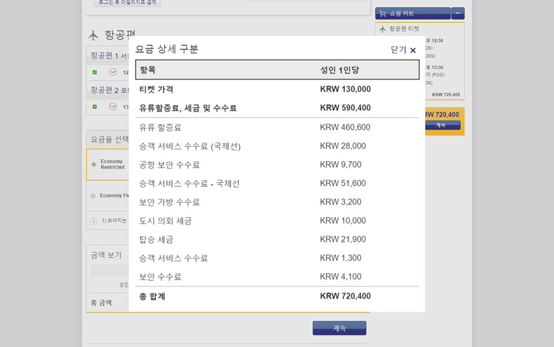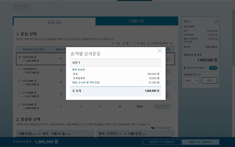 대한항공은 파리와 로마 모두 직항으로 운항하는데, 유류할증료가 4만원 이상 내려갔다.
