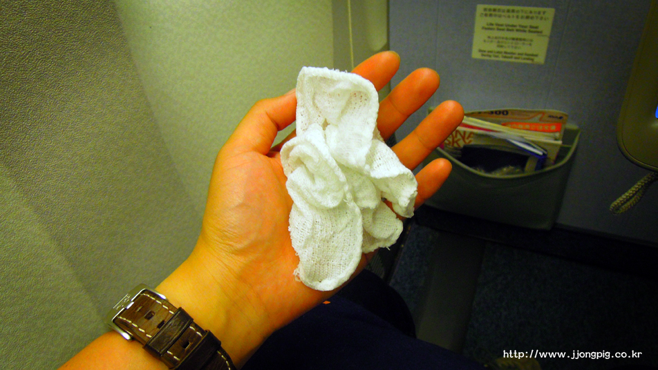 처음에 따뜻한 물수건이, 그리고 음료와 스낵이 제공된다.